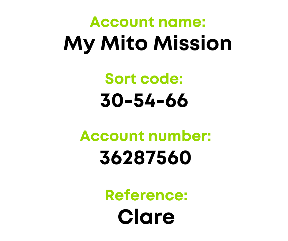 Spreading the word, following, sharing, as well as donating and raising funds are all really helpful and valued. From running a race to holding a bake sale, hosting a collecting can to giving out Clare’s Mito Mission leaflets – there are so many ways in which you can get involved.
