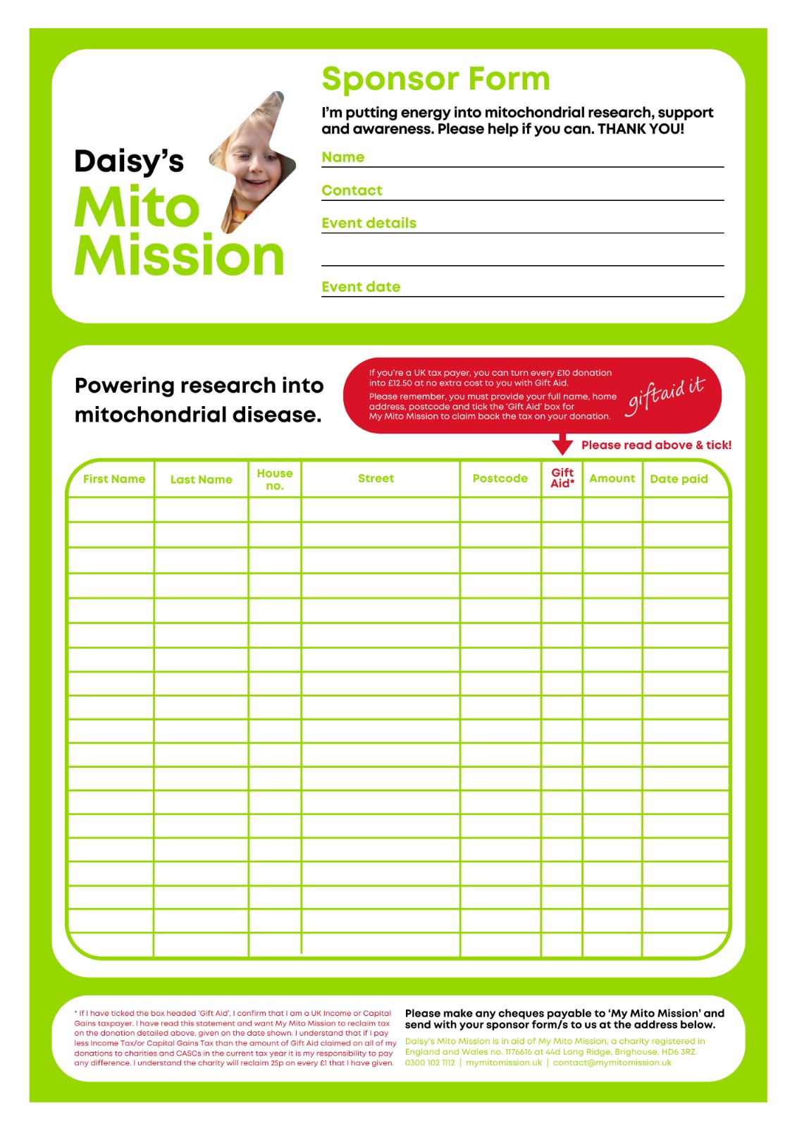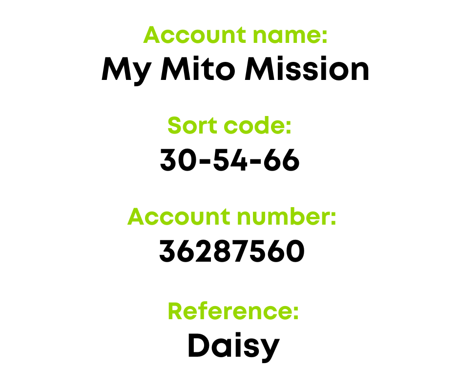 Spreading the word, following, sharing, as well as donating and raising funds are all really helpful and valued. From running a race to holding a bake sale, hosting a collecting can to giving out Daisy’s Mito Mission leaflets – there are so many ways in which you can get involved.