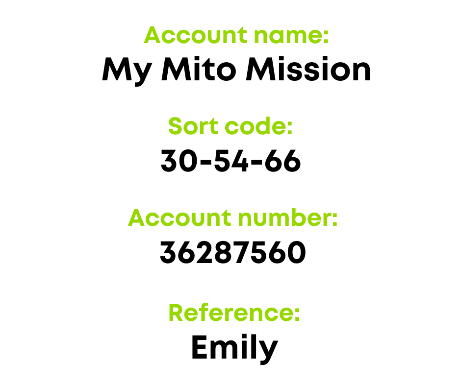 Spreading the word, following, sharing, as well as donating and raising funds are all really helpful and valued. From running a race to hosting a bake sale, giving out Emily’s Mito Mission leaflets to finding a home for a collecting can – there are so many ways in which you can get involved.