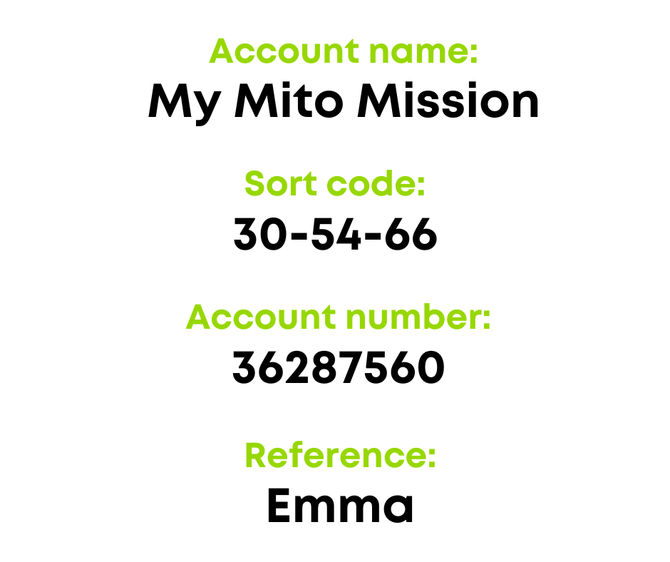 Spreading the word, following, sharing, as well as donating and raising funds are all really helpful and valued. From running a race to hosting a bake sale, homing a collecting can to giving out Emma’s Mito Mission leaflets – there are so many ways in which you can get involved.