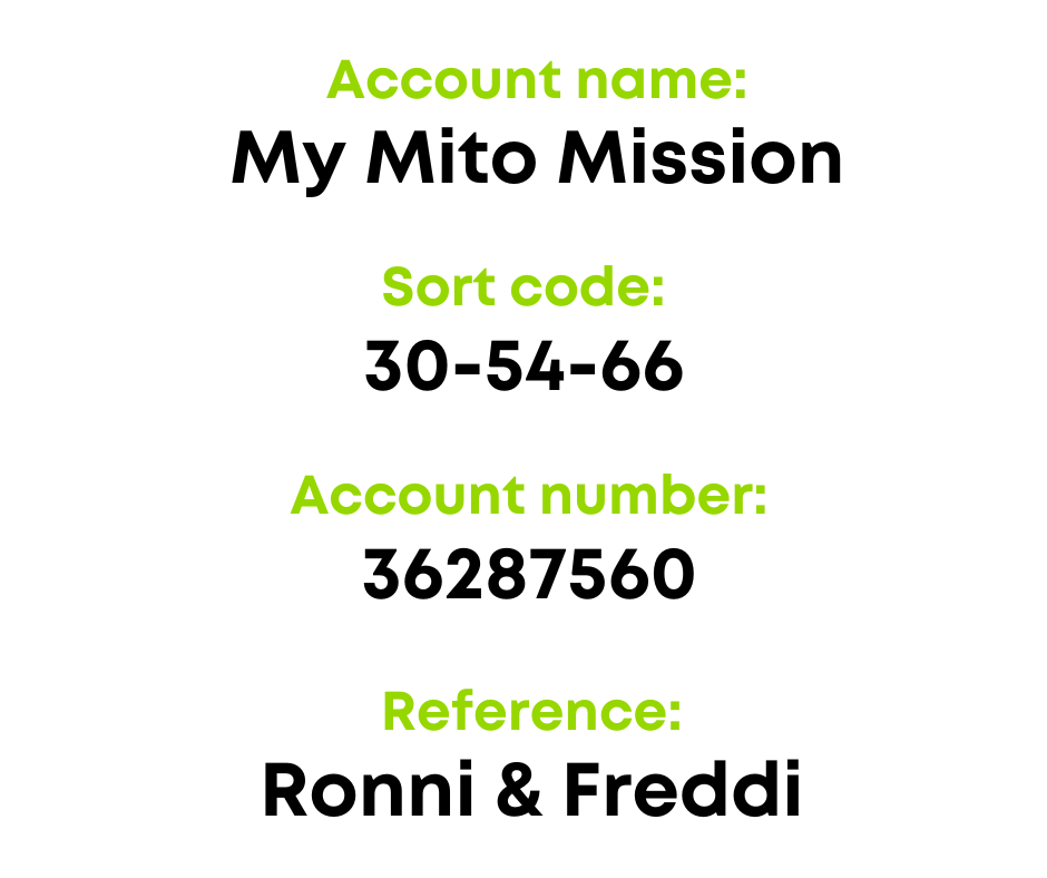 Spreading the word, following, sharing, as well as donating and raising funds are all really helpful and valued. From running a race to hosting a bake sale, homing a collecting can to giving out Ronni & Freddi’s Mito Mission leaflets – there are so many ways in which you can get involved.