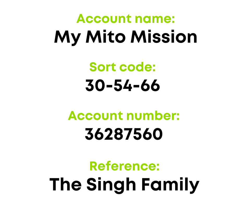 Spreading the word, following, sharing, as well as donating and raising funds are all really helpful and valued. From running a race to holding a bake sale, hosting a collecting can to giving out The Singh Family’s Mito Mission leaflets – there are so many ways in which you can get involved.