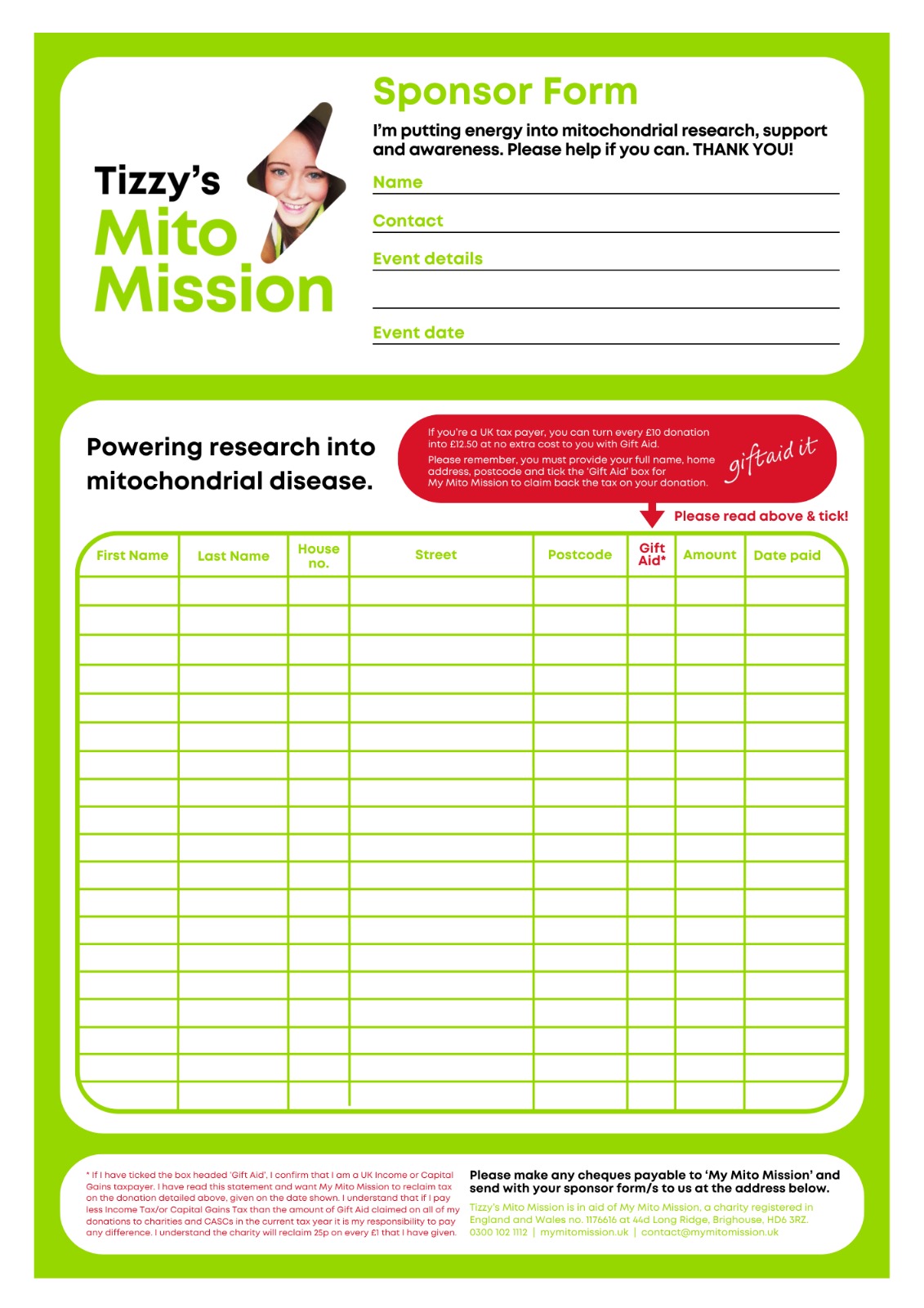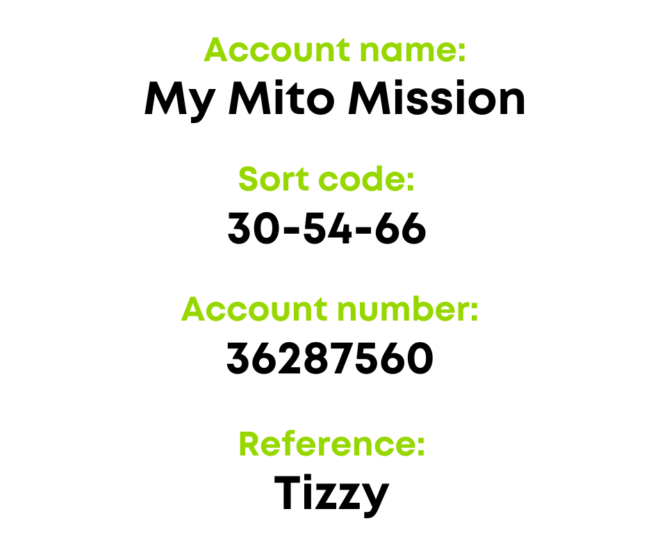Spreading the word, following, sharing, as well as donating and raising funds are all really helpful and valued. From running a race to holding a bake sale, hosting a collecting can to giving out Tizzy’s Mito Mission leaflets – there are so many ways in which you can get involved.